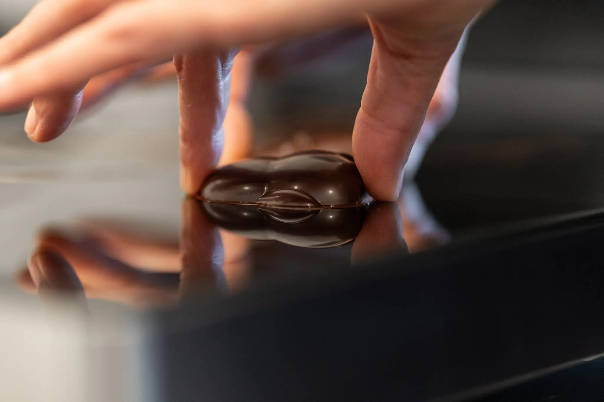 Après le garnissage, les bonbons sont à nouveau soumis à un processus de cristallisation pour assurer une cohésion parfaite entre le chocolat et les garnitures.